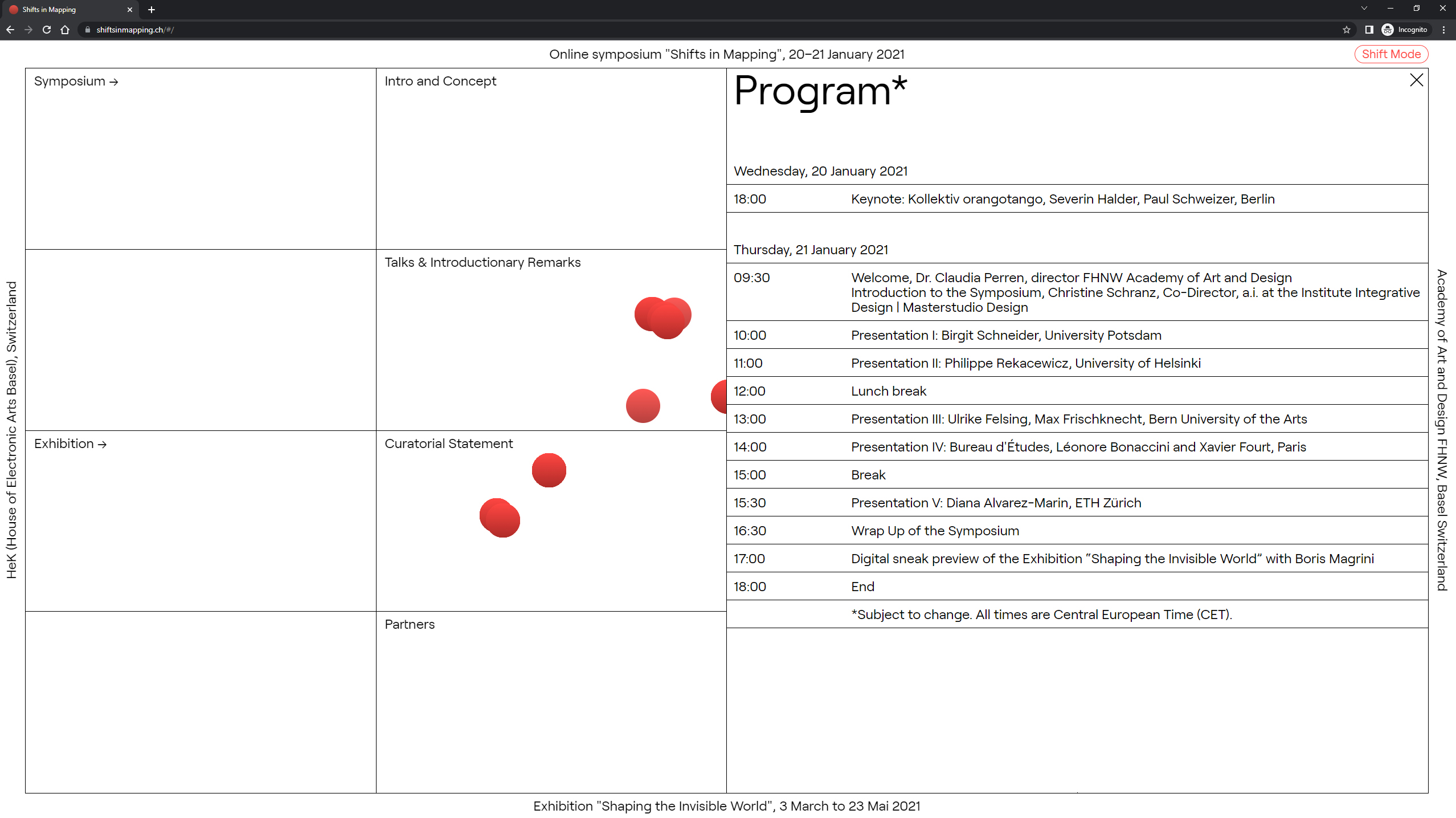 In February 2021, an online symposium “Shifts in Mapping was organized at the FHNW Academy of Arts and Design, Basel. To exchange on the topic critical maps with wider audience, renowned researchers, designers, artists and architects were invited to to discuss current positions, projects, concepts and methods around cartography and the medium of the map in a larger context: scientific, artistic, and technological. The symposium was attended online by more than 1.200 participants from more than 20 countries.